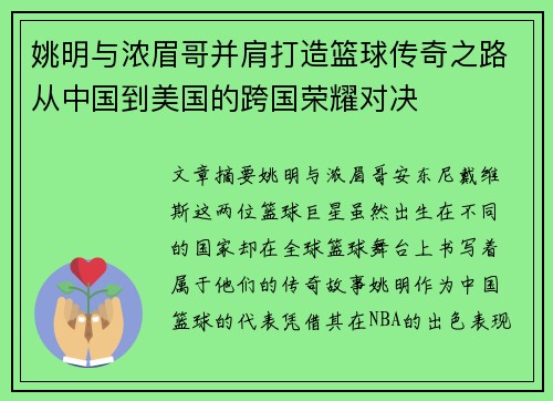 姚明与浓眉哥并肩打造篮球传奇之路从中国到美国的跨国荣耀对决